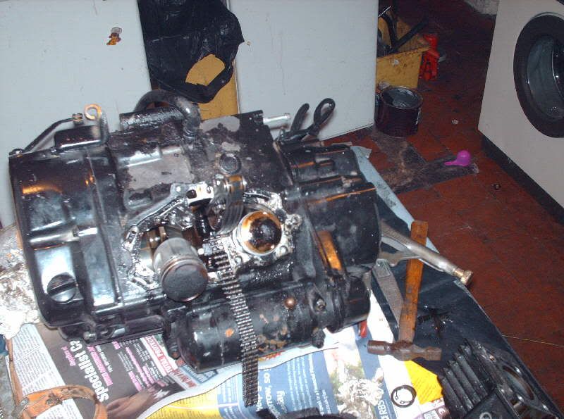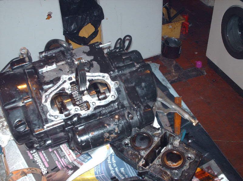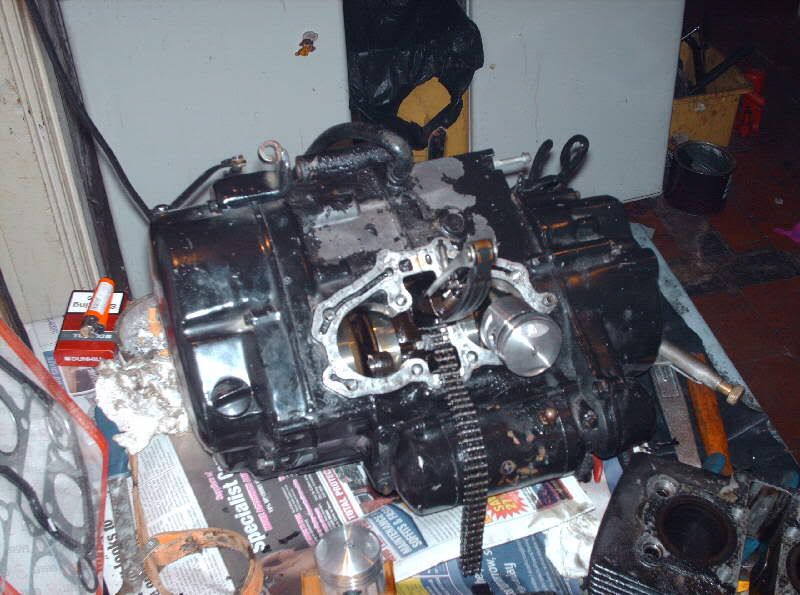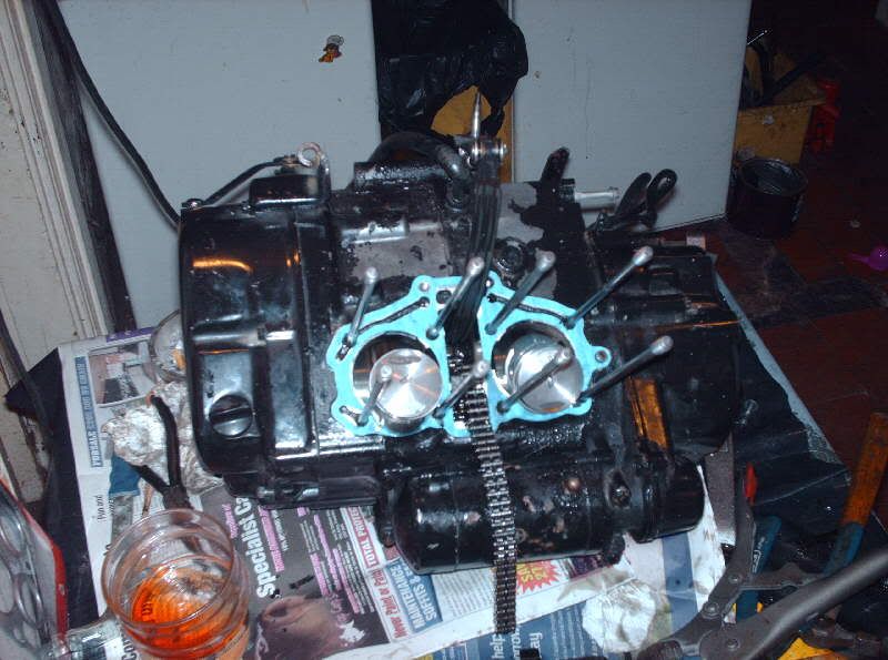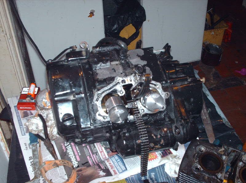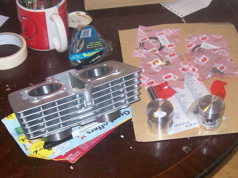 With the amount of smoke pouring out the tail, a rebor was almost inevitable. Priced up, a pair of pistons and rings are roughly £60, a rebore about £30, and then you need gaskets, so its a £100 job. Meanwhile, logistically, you strip motor down to the bottom end, thn hoik heads and barels to M/C shop and wait a week for them to be cut, while you twiddle thumbs, so an e-bay special barrel kit for £85, not only saves a couple of quid, but waiting around too!