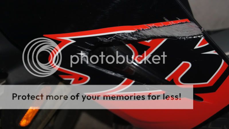Triumph - can't see any damage. What I *Think* happened is that the 'leg crusher' marked was stuck in the back of my leg (there is a big bruise and a small nut-shaped indentation and cut, hardly bled at all) when I hit the road.