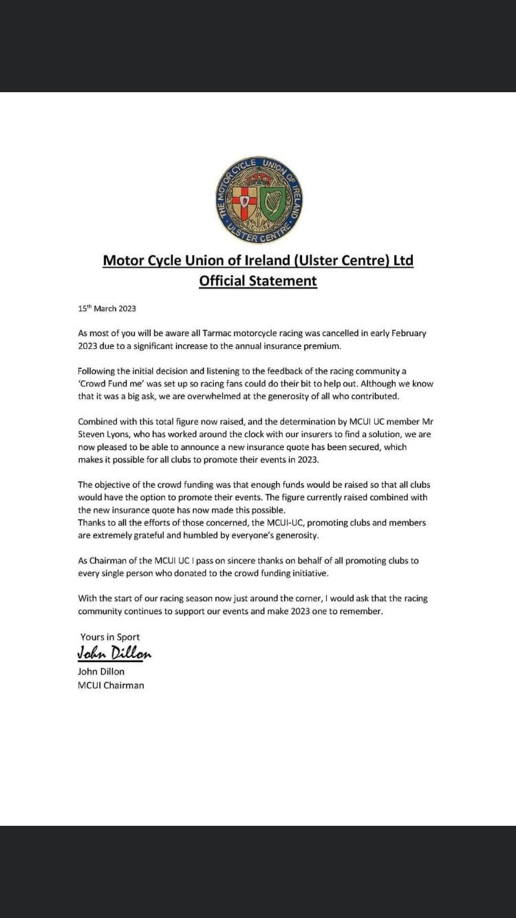The Motorcycle Union of Ireland has announced that all road racing and short circuit racing in Northern Ireland has been cancelled due to spiralling insurance costs."
