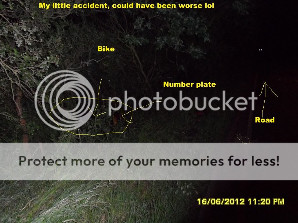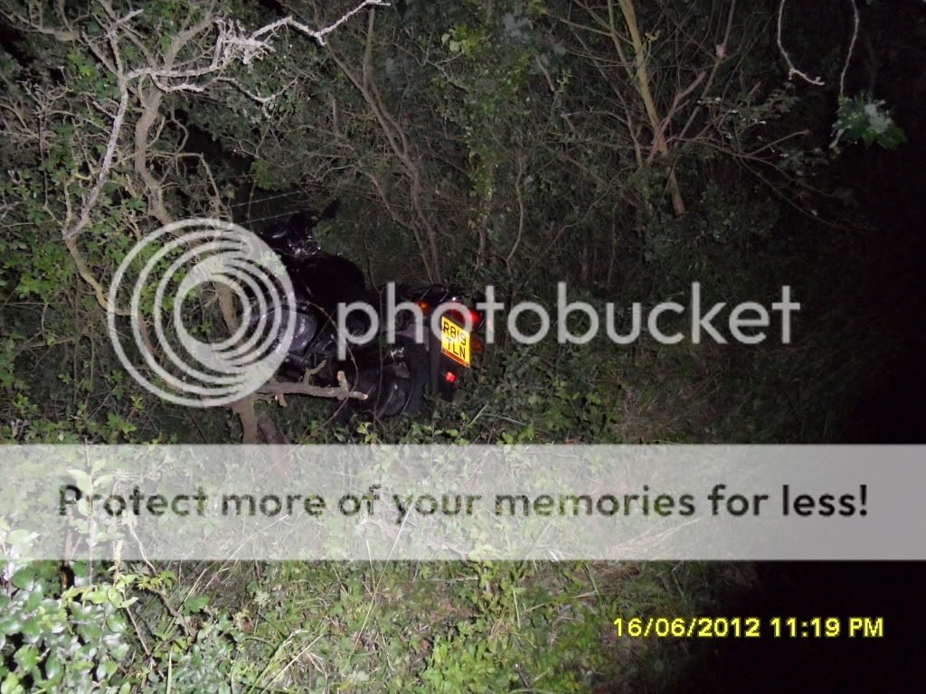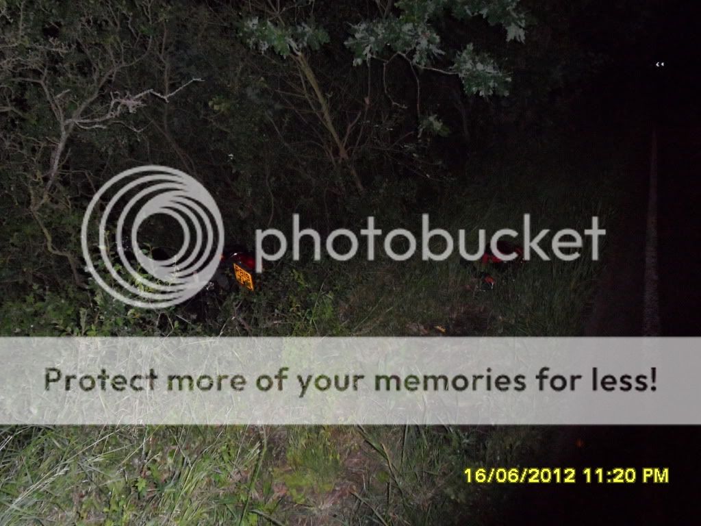 Was still drivable once pulled it out with the car lol, I was just going a bit to fast round the dark lanes and ran a little bit wide and then caught the verge threw me off then bike crashed / went in the hedge / ditch ..... lol