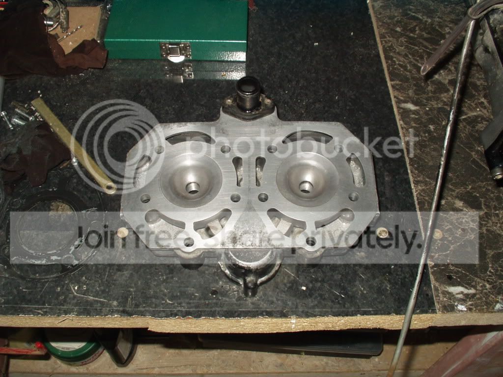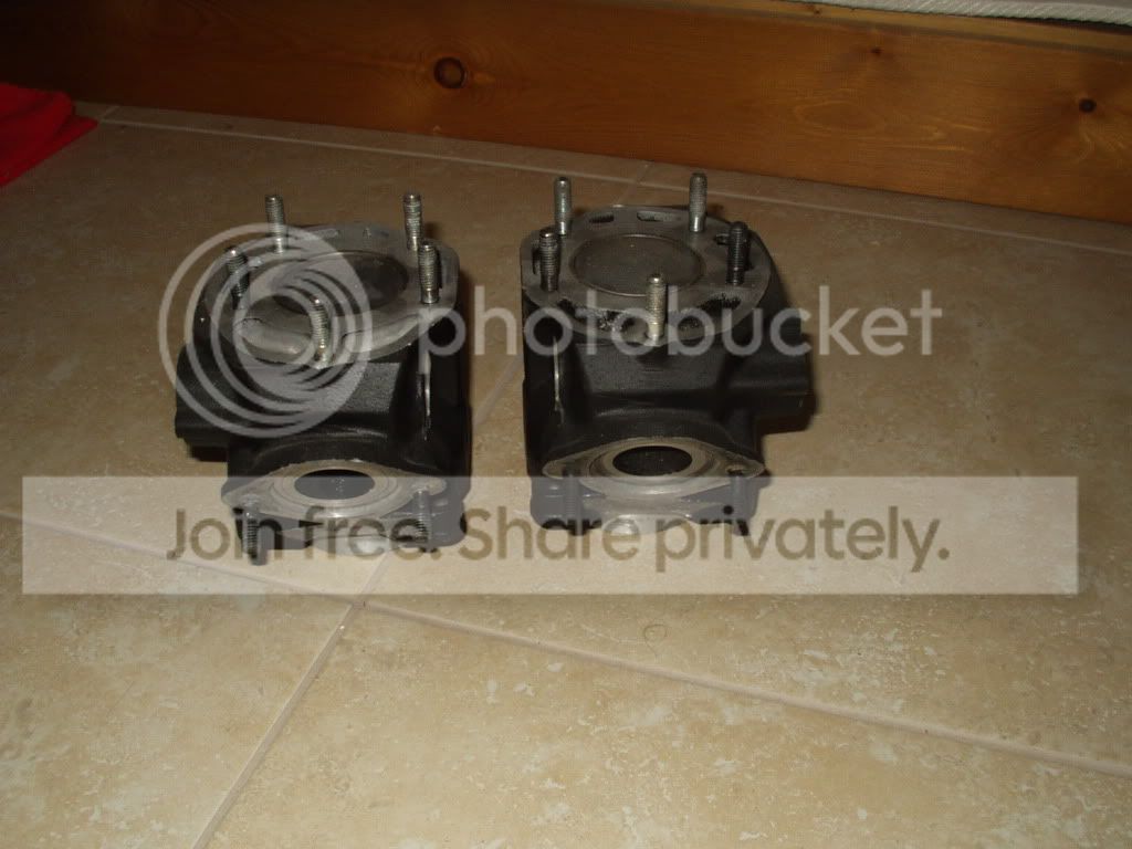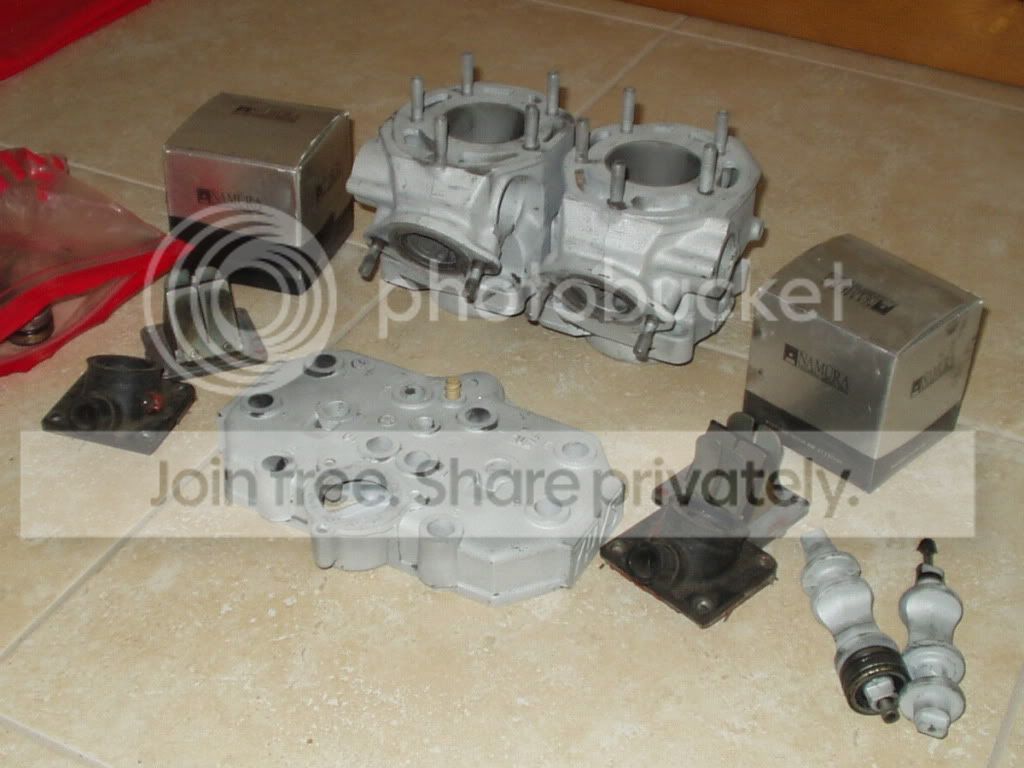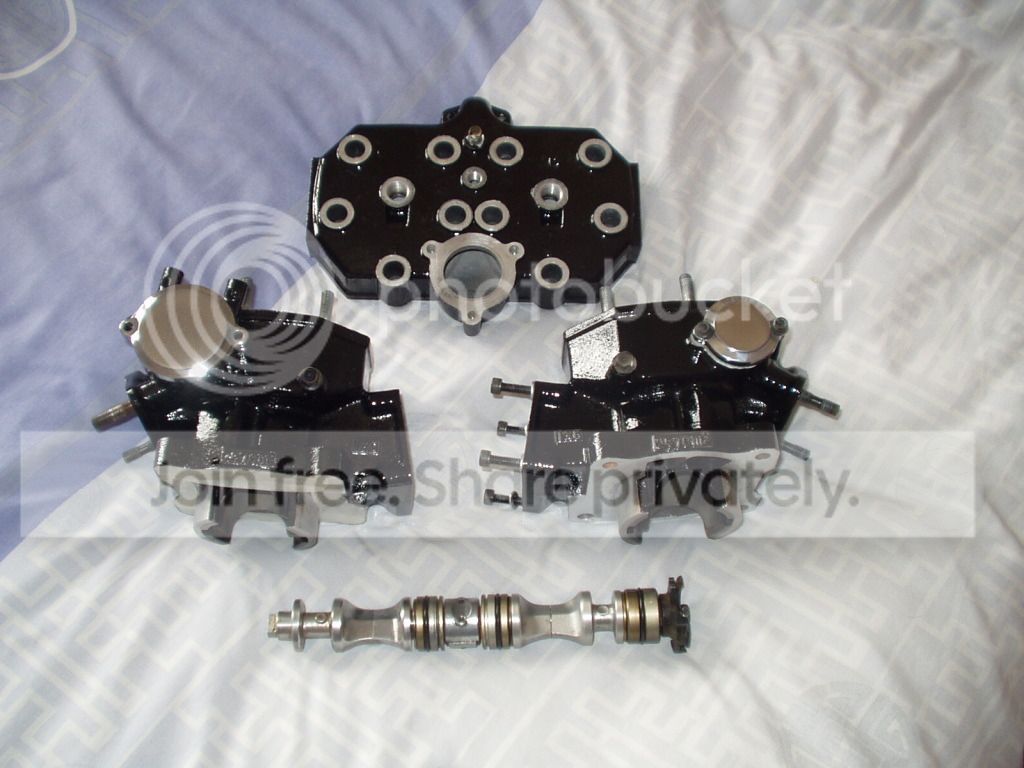 Picked this lot up a couple of weeks ago for 120 Euro, head barrels, pistons, powervalves and reed blocks, all sand blasted. There is quite a lot of pitting on one cylinder head, will have to try and polish that out.