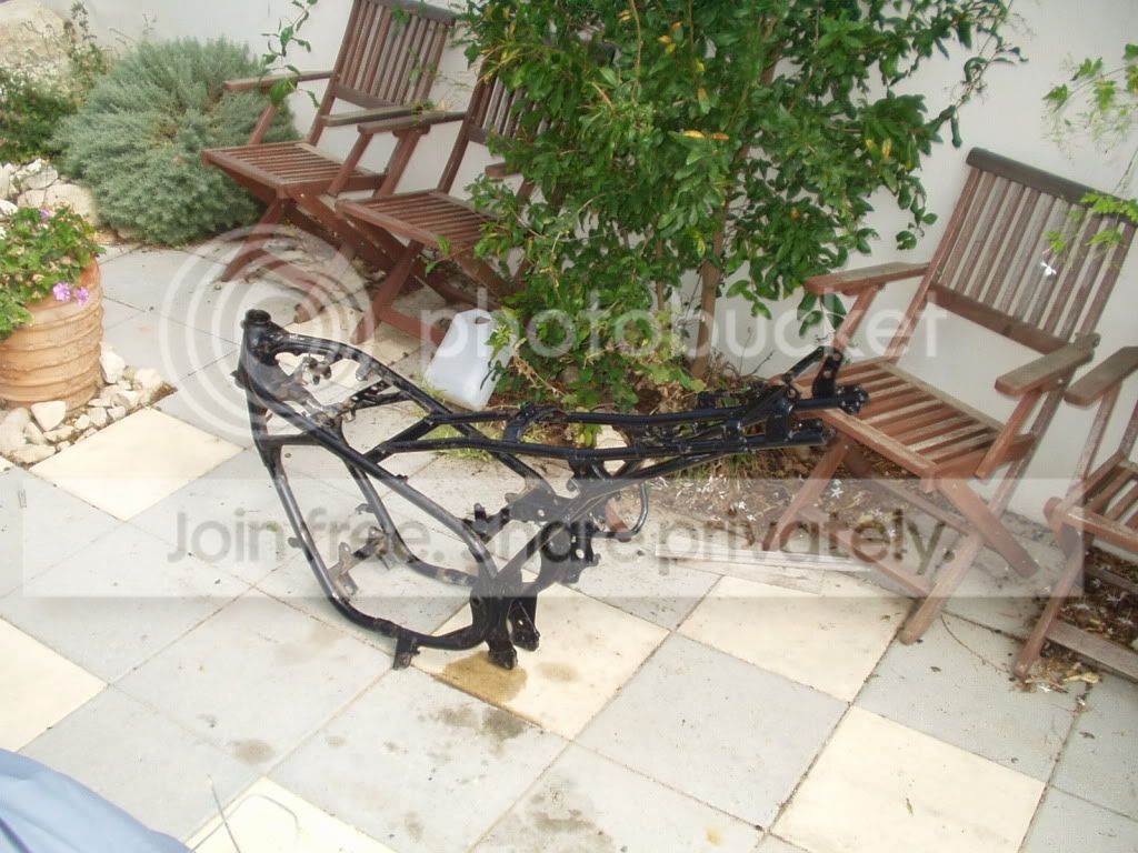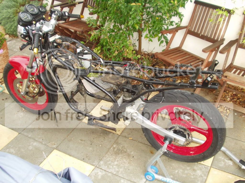 Anyway, between thunder storms, this weekend, started to strip everything off the bike, et voila, we now have a rolling chassis.