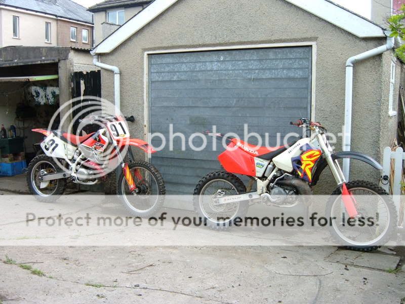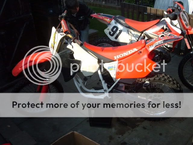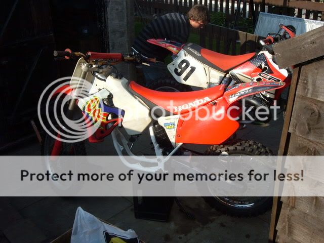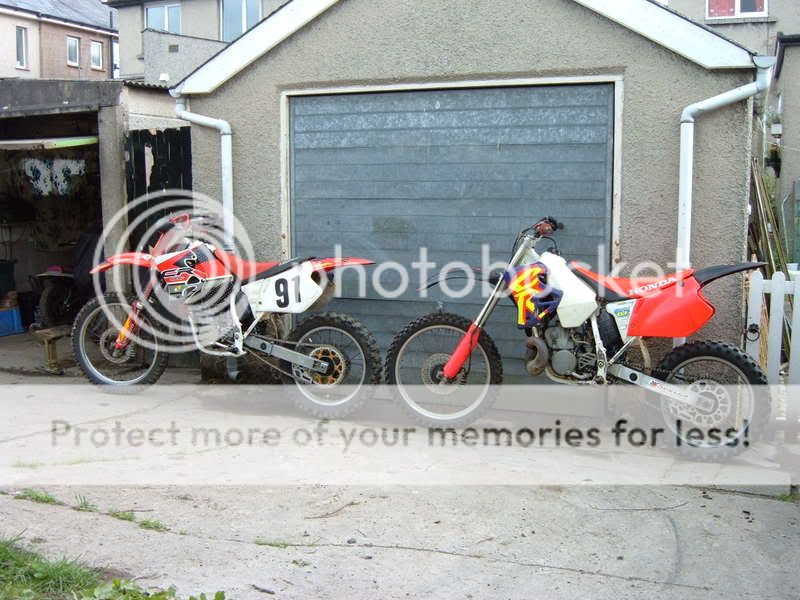 hi just got back before from picking up my 95/96 cr 250 took 4 hours to get there and back but im quite happy with it so far, i bought it off ebay for £410 it has very low compression so obviously doesnt run but all the bearings suspension e.tc are all good and not fucked only thing really is it could do with a new rear tyre and some fresh plastics, but il get that once engines sorted which il be stripping down after ive had some tea lol, so il post up pics of the damage so heres some pics of her and my bros bike aswell