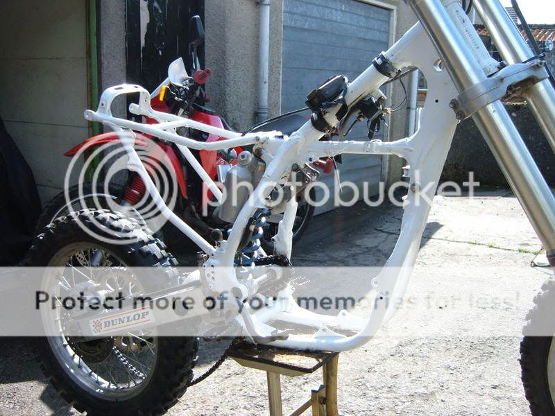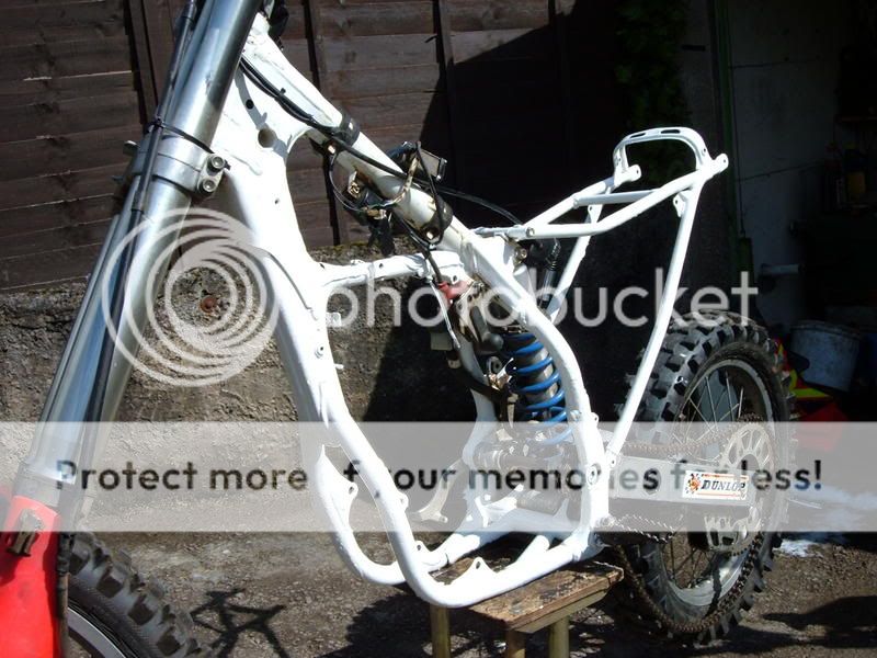 right well seems engines nacked ive got my dealer to price a wiseco,genuine and prox piston kit and same for con rod kit which il find out on monday, anyway yesterday i stripped down the brakes and gave them a good clean and lube so there all good now, and ive started rubbing down mudguards im gonna get some new plastics anyway but there gonna be spares also resprayed front exhaust which looks like new now, and last night took engine out didnt take long at all really, then today took all air box and everything off and started cleaning the frame and getting it prepared then painted it see pics i think it looks much better, well pleased with it just need to get engine rebuilt next month Smile :thumbsup: