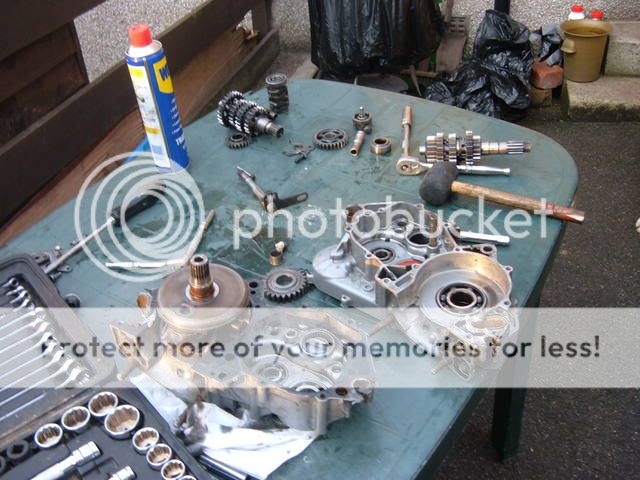 right anouther update got my engine split all parts here and one of teh shafts with all the gears on had a chunk out of each one so needed a new one of them and the selecter drum and anouther cog been looking around and a guy 20 mile from me was selling this bottom end with a snapped con rod but he said if the gearbox was nacked he'd take it back and refund us it was £70 casings are nacked but i just wanted the box so got it back tonight and split it and it was all good so taking the bits round to garage tomorrow and hopefully it be all rebuilt by end of week Very Happy