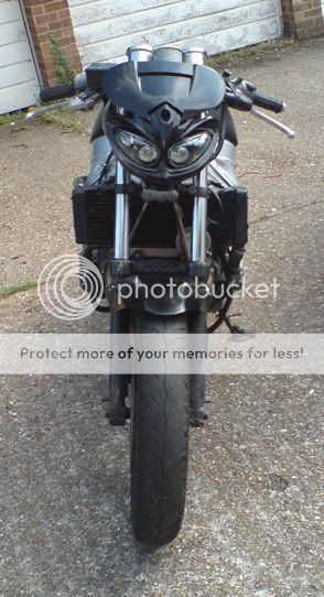 A couple of days ago my new headlight fairing came through from busters. Very very nice IMO. Especially for the bargin price of £30! And lets be honest i couldnt wait! So off came the twin lights and that horrible piece of fairing and on goes this wonderful piece of sex. (granted i havnt actually wired it up yet as i dont have a soldering iron or anything - but give me time! I just wanted to see what it looked like, and i wasnt dissapointed. Twisted Evil