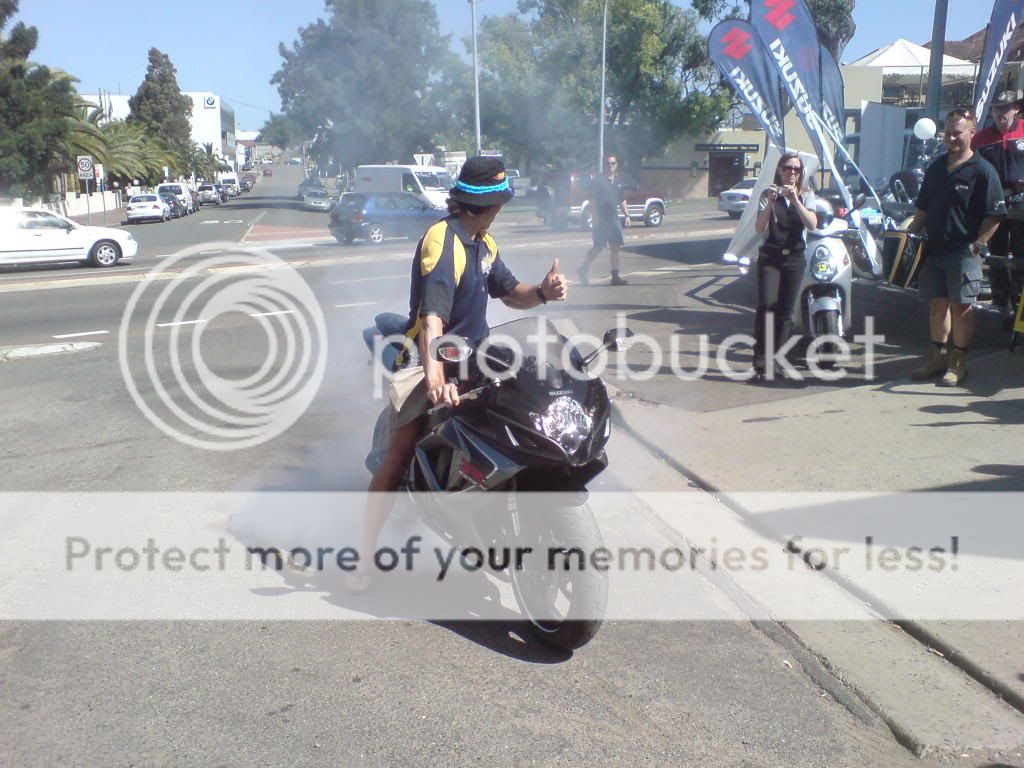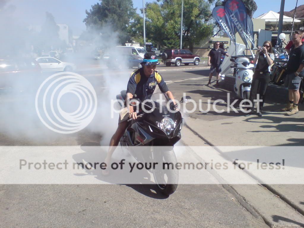 They pulled a GSXR out of the showroom to take some photos of Chris on a Suzuki in front of the dealership. Chris didn't need much encouragement from the crowd to cut loose