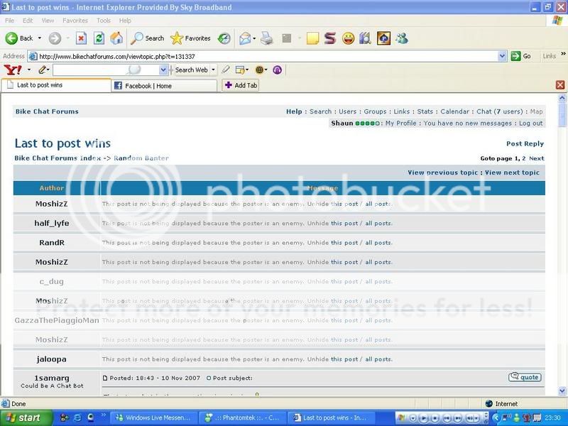 I'm not that happy with it, as you can see from the picture below I still have to see their usernames. Could it not be changed so that when you set someone as an enemy their posts do not show up at all and neither do any threads strarted by them. Also could I set people to enemy by simply typing their username in somewhere, takes a while when BCF is being slow and you have to go into a load of different profiles, thanks.