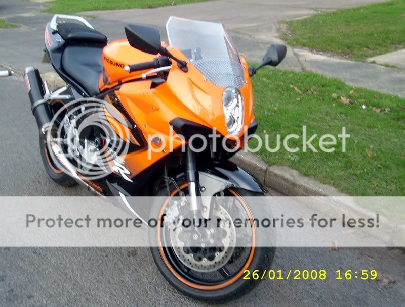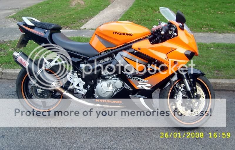 cheers for the welcome mate  ____________________ HYOSUNG GT650R, SCORPION TITANIUM CAN, REAR HUGGER, 14 TOOTH FRONT SPROCKET, HEL PERFORMANCE LINES, CRASH BUNGS, DB SCREEN, SINGLE SEAT COWL  |