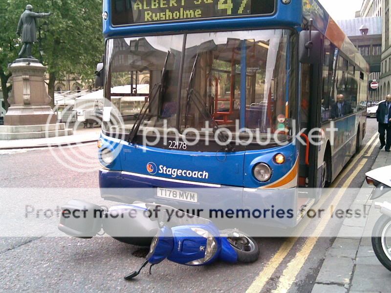 Later on when my dad and 3 police officers were discussing how to get the scooter out they decided to reverse the bus and pick the bike up. The bus driver gets in, turns the the ignition on, shoves it in first and drives over the scooter Rolling Eyes Laughing