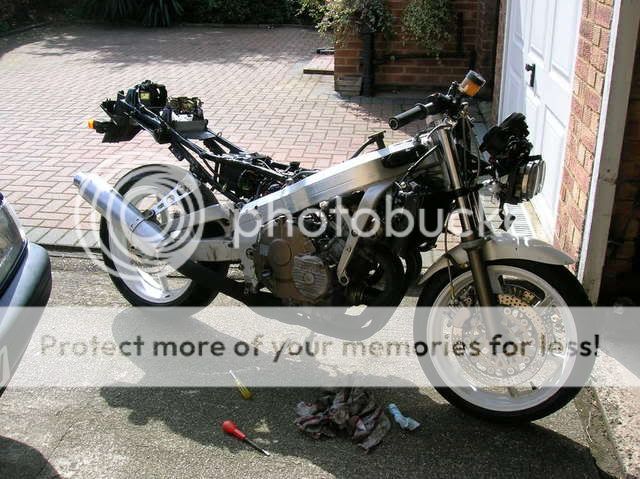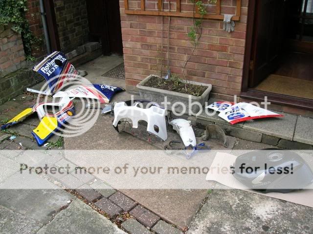 The plans really for the bike are to tidy up the damaged fairings as best I can, then matt black the lot (or maybe experiment with gloss black, but from experience it seems much easier to get a decentish finish in matt black then gloss). Im on a rather tight budget so there seems no point in spending big bucks on an old cheap bike cosmetically anyway. Since I have NC29 wheels on it that are nicely powder coated white I'l get a white sticker kit from ebay and have all the transfers white, then just have a ball on the bike, greater improve my riding skills, then either give it the full resto treatment, or move on up to a 600.