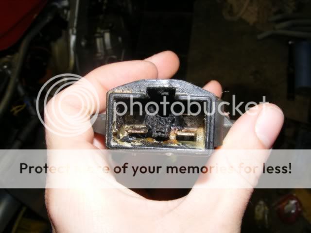 You can see one the the spade connectors had completely blown off, and the other yellow wire was pretty badly burnt.