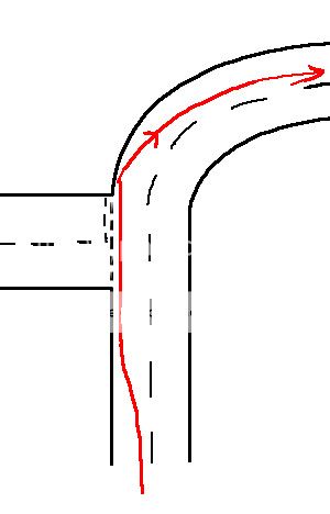 With that bend you showed there, I'd probably sit just right of the centre as i approach the junction, and move back into the middle as i pass it (and the danger) and then sit slightly off to the left around the bend, giving you a good view through the bend. That is atleast, te ideal. In practise, I'm always too close to the dotted line. It's easier to suddenly change direction and run wider, than it is to suddenly tighten it up!
