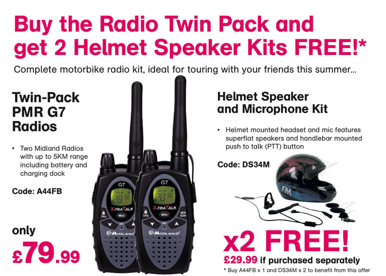Maplin are currently running an offer on a set of 2Way radios wherby you get two helmet kits for free when you purchase them so essentially a full two person radio kit for 80 quid which I don't think is a bad offer Question