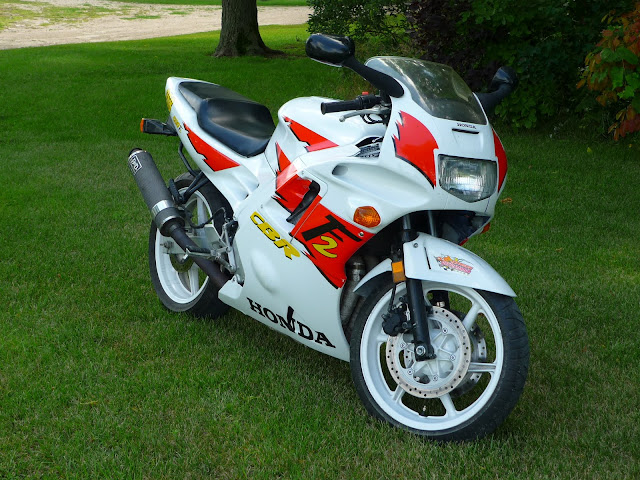 Well I just wanted to show u guys my '93 Honda CBR600 f2. Its my first real bike to ride and to own. I bought it for only $1000. Needs choke cable and new chain. Tires are getting down there but good for awhile. She has about 21,000 miles on her. Everything is stock other then the D&D exhaust...I think.