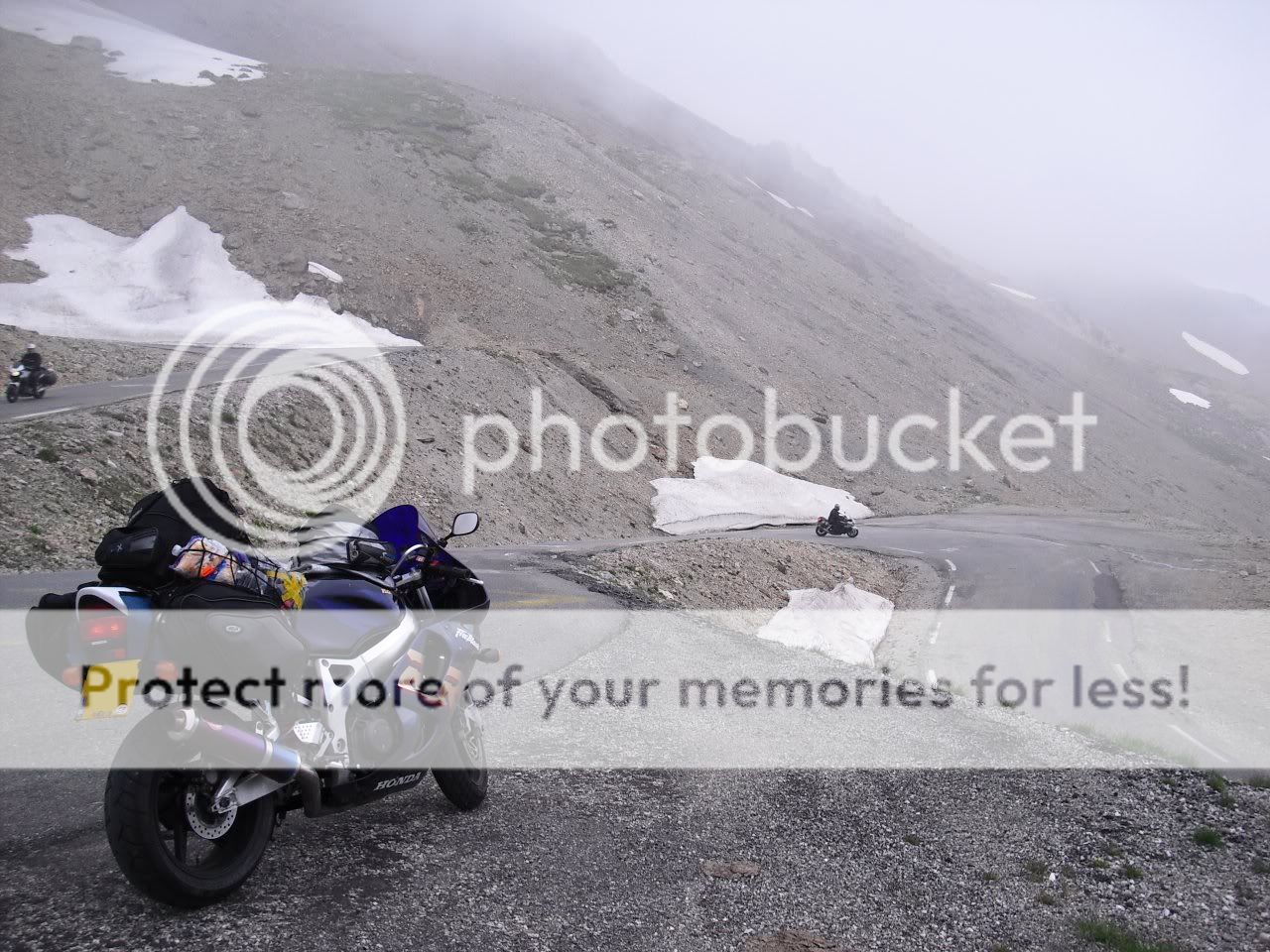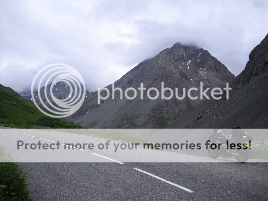 Back on motorway at Albertville and came off at the Col du Telegraphe and then along the Col du Galibier, a great road (one leads into the other), Galibier was very cold, quite a bit of snow still around there. Then headed down into Briancon where I camped, had a quick ride upto the walled city for a mooch and back to the campsite as the storms came in from the mountains. I also noticed at this point that the item that hit my foot on the M25 was my right bar end, I had to space it lastyear when I fitted heated grips, obviously worked loose, also lost a mudguard screw somewhere.