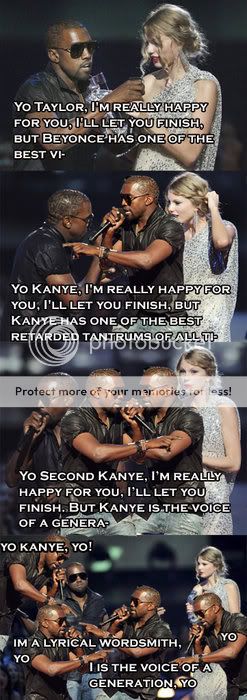How good would it be to interupt his next awards speech, "Kanye, I'm gonna let you finish, but you really are a gay fish."