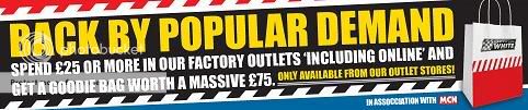 My partner ordered a rucksack from George White and ended up with a free goodie bag of sorts. It was an oxford helmet bag, ear plugs, 3 oxford comfy neck warmers, bright orange tank protector, tyre pressure guage, small oxford toolkit (which has proved very useful).