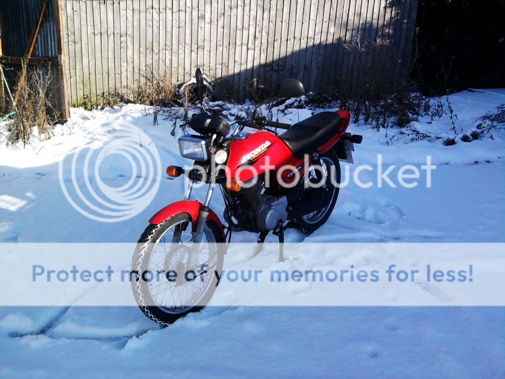 i rode home up the A1 into durham on saturday evening and hit the entire snow storm, i got into my estate from the motorway (which was under an inch of snow) and had the rear end throw me into a 180. i perservered home and crawled at<5mph with my feet down, touching the brakes locked them and i couldnt see out my visor. Bad crack man...  ____________________ Current Bike: 1996 Yamaha TRX850 (The Japanese-Ducati One).