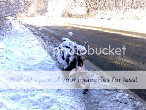 However once the ice started to set in that is an entirely different matter, things get a lot more dangerous and so because I've been able to borrow a family car I haven't used my bike for the past couple of weeks. I'm hoping it'll thaw out next week for the bike though as I can't keep affording the insurance costs of £50 a week! Never mind the fuel costs...  ____________________ Previous: Aprilia Habana Retro 50cc (beauty), Yamaha SR125 (fell apart), Honda XR125 (nippy little commuter), Honda SLR650 (Geewhizz), Yamaha Diversion 900S (Smoooooth) written off courtesy of a stupid escaped horse.