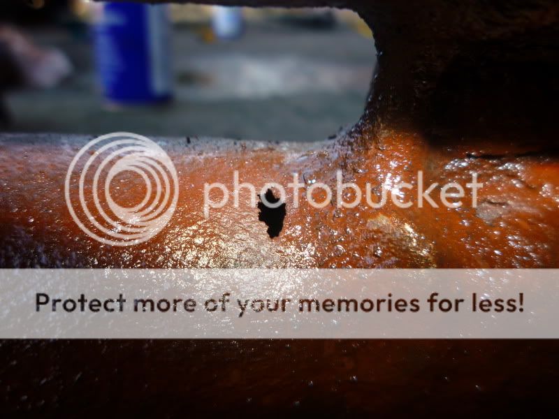 Came home after work and attacked the bike with a ratchet! What a pain in the arse! Got the whole exhaust system removed (quite proud of myself really Razz) but while cleaning the downpipes I found a hole!