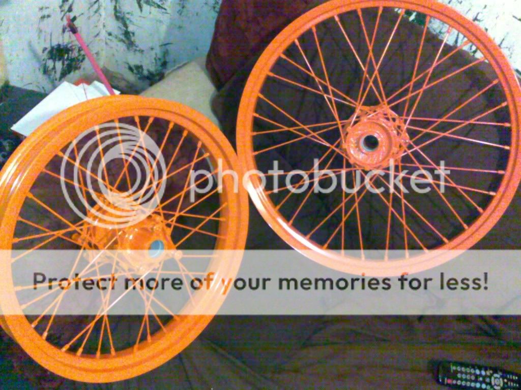 next came the wheels, i striped them down cheeked for buckals and sent of to imf darlo to have them powder coated orange. came back looking stunning and only cost 50 quid for the pair