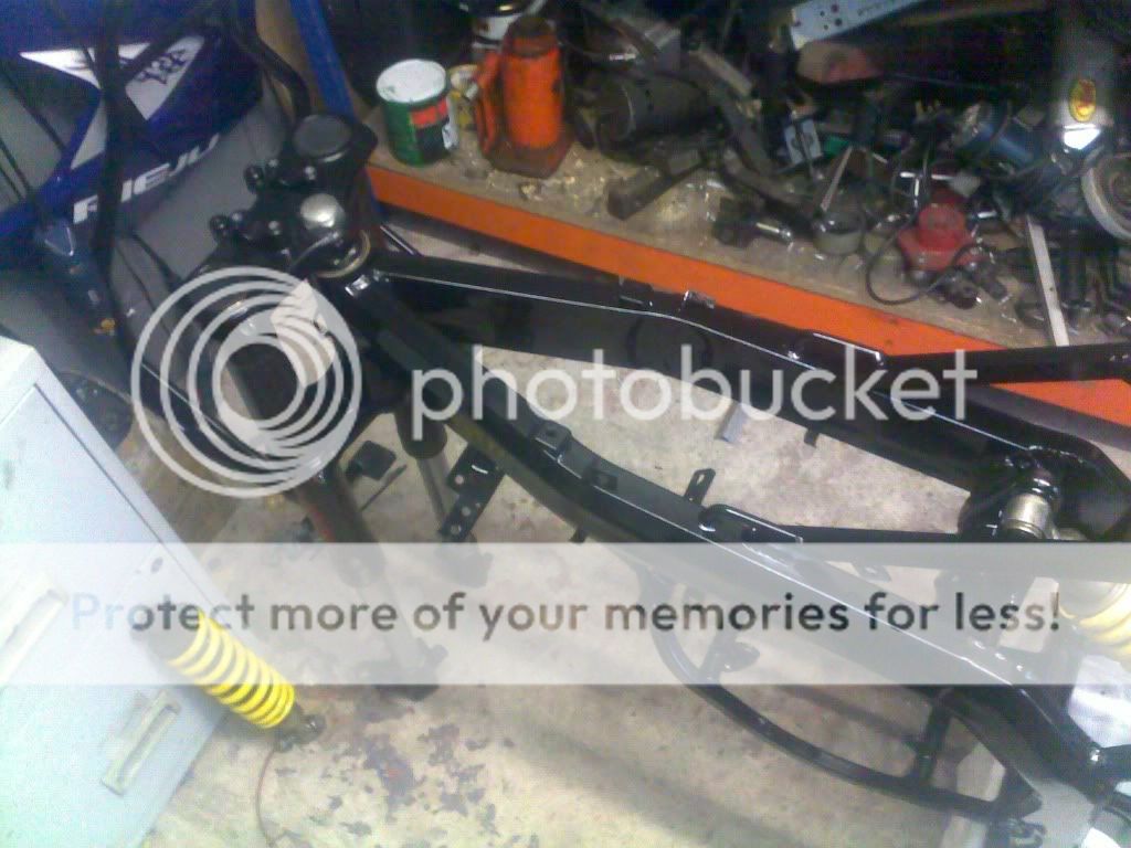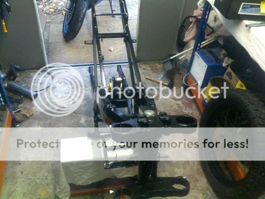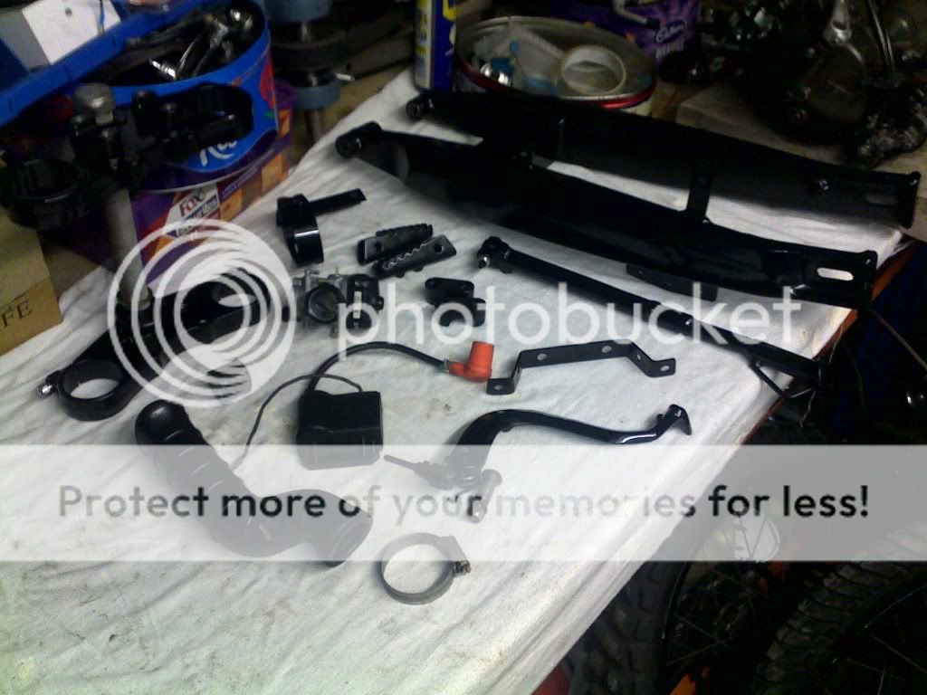 so here i am with all these crazy ideas in my i head and there is only 1 thing to put them in action and that is go rip bike apart lol so out 2 a cold shed at the start of winter to rip the standerd factory shit apart within around 2-3 hours engine was out and frame was striped aoff all componets but sadly forgot 2 take photo so will carry on so there i was with lots of parts i shorted a large box of part to take 2 imf darlo to be blasted and recoated black i took these 2 find i could have back in a week so mad me put my overalls on over that next week on night after work 2 prep frame for blasting and coating the flowing week.