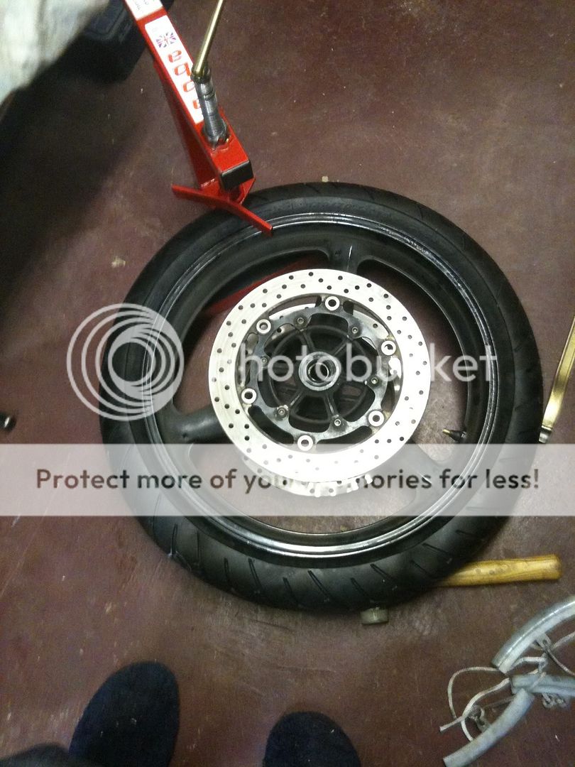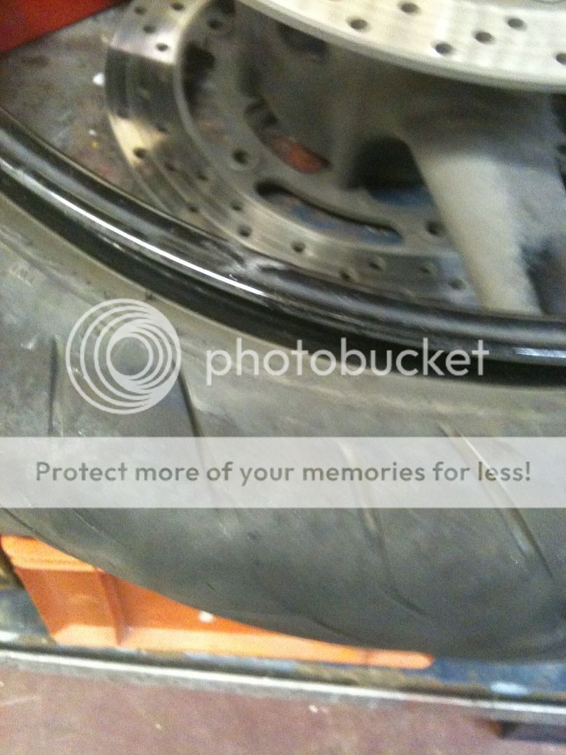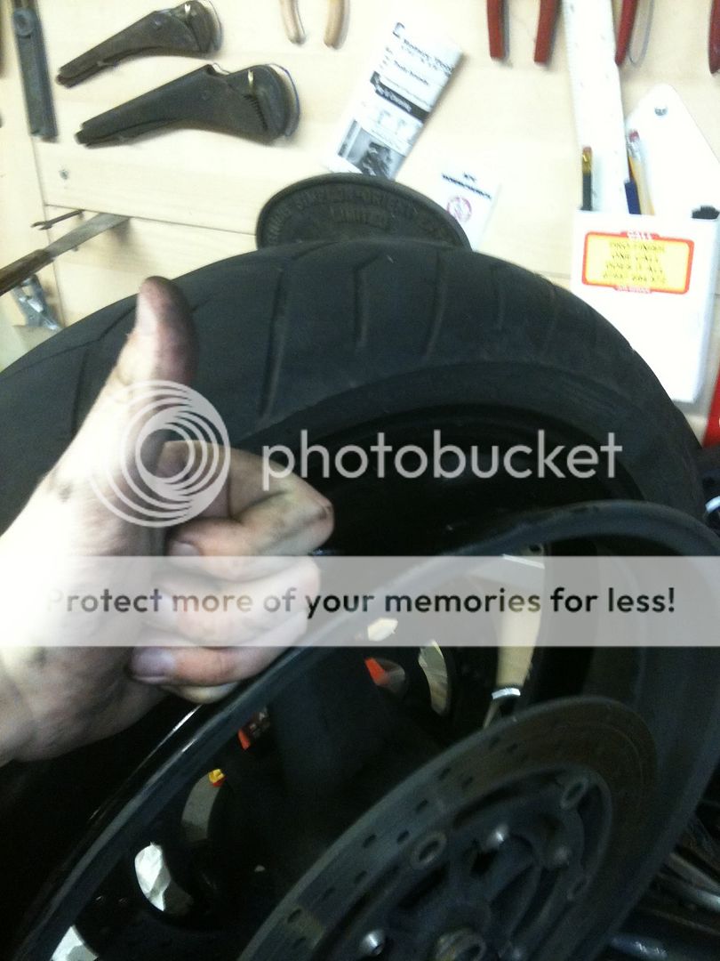 Your wheel balancer is too small for rear tyres moron Make me another one, Rear went on fine infact putting the rear wheel back on the bike was harder than fitting the tire, it took about 10 minutes to get the rear wheel off another 10 to get the tyre off 25 to get the new one on (had abit of trouble) then 5 to balance it then about 40 mintes to get the rear wheel on and adjust the chain. Had loads of trouble holding up a heavy wheel whilst trying to ensure the 2 spacers stayed in place and lining the brake disc up with the caliper whilest trying to line the spindel up with the holes.  ____________________ Well, you know what they say. If you want to save the world, you have to push a few old ladies down the stairs.