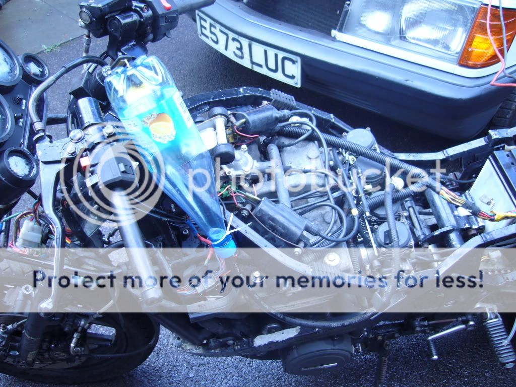 Anyway, so I had a couple of hours yesterday and I thought I would see if i could get it started. So I fitted a new oil filter and filled it with oil. Tightened all the coolant pipes and filled with coolant. Rigged my temp tank and I was ready to go. Jumping from the car battery as mine is dead, all looked well, oil, stand and neutral light on! Press the starter and nothing- BIKE IS DEAD. Then I spend an hour fiddling and the thing is still dead. Pressing the horn button gives the most feeble wheeze possible and the starter will not even click( just like a dead battery, but the car one is good, starts a diesel benz anyway) Shorting the starter relay gets the starter working and it is good, but the bike wont start. Check more and I have no spark. So I retrace my steps, check everything as I have not done a drastic rewire just cleaned it all up. I find that I have switched the junction box and ignitor box plugs-shit. Have a burnt the effing thing out now? So I reconnect the correct way and there is still nothing. So I wheel the whole bag of bits back into the garage and close the door.