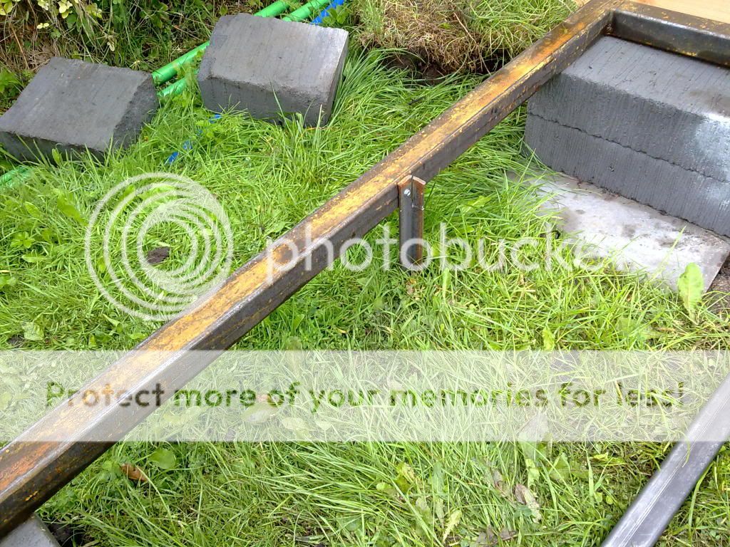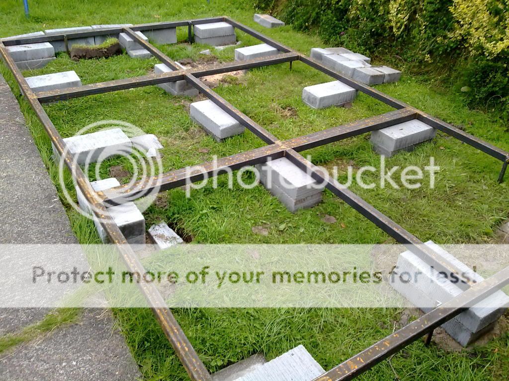 We phoned to see when the shed would be delivered – when on the phone to them, only then did they think it wise to tell me the base comes in 3x equal sections sections, making my previous hard work completely void, I was not amused. The chap on the phone explained that the sections are 14ftx8ft divided equally into 3 (i.e 56”x96” each). Fine I thought, will just make a metal frame (well, dad will make a metal frame), that will sit on top of my blocks, that will support every side of all 3 sections.. sorted.