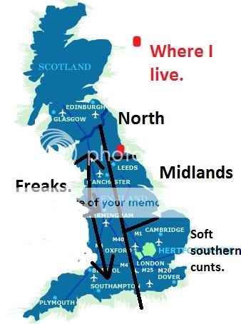 Please note that I only did the North / South divide as I see it and not done the East / West so no shouting from the hills, Flip!! ____________________ 'The core of a man's spirit comes from new experiences'