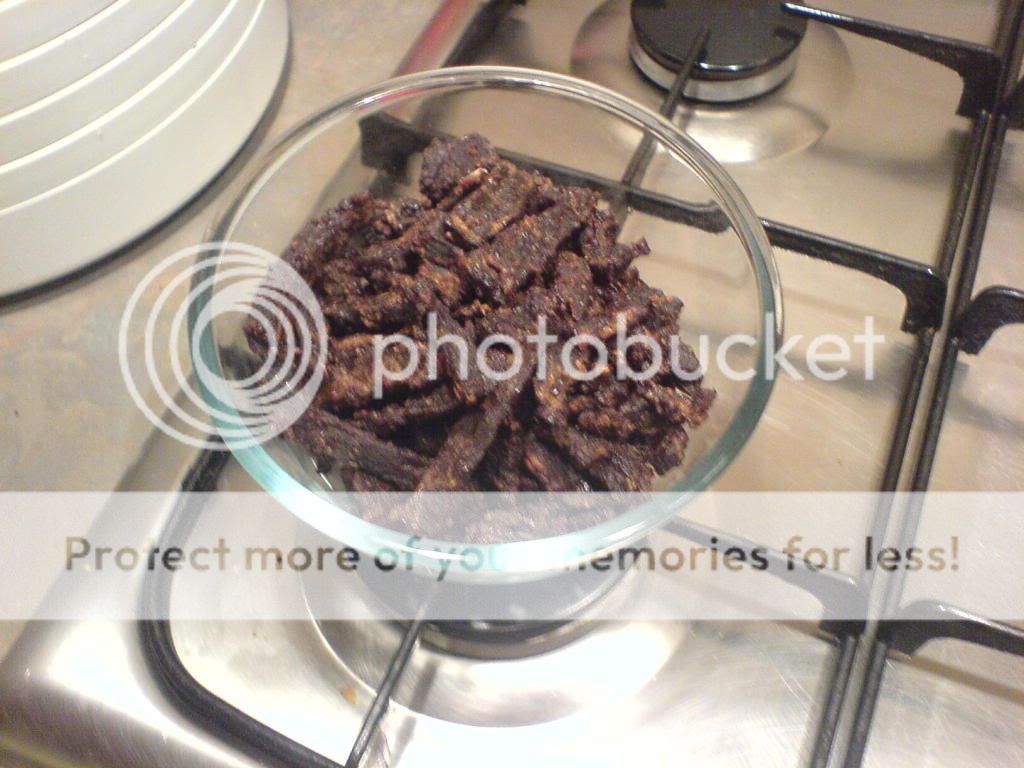 Step 1: The beef; I generally use cheap frying steak as sold in supermarkets as it is quite lean and generally the correct thickness (7-10mm). I have used beef joints and cut them to size (freezing slightly beforehand helps in getting a straight cut) and this time I used something I haven't tried before, precut frozen beef strips from Asda. They worked well but several pieces had large fatty sections which make the final product spoil quicker than a lean jerky.