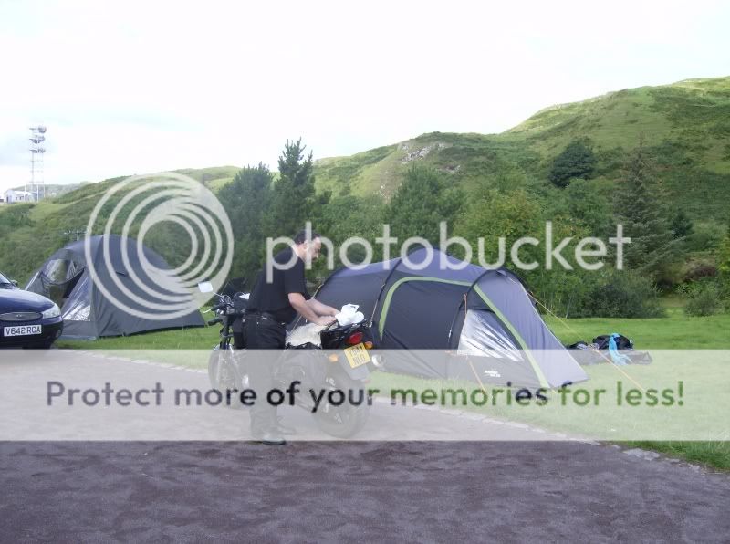 Singed pants and t-shirts, but no major damage. Undaunted, we continued. We got hit by a massive downpour just as we got into the Lakes and took shelter in a cafe; the rain stayed with us from just outside Kendal, all the way through the lakes. We camped at Thirlspot, just at the foot of Helvellyn and next to the King’s Head pub on the A591. This is a bike friendly campsite attached to a farm; the reason it’s Bike friendly is best explained by the fact that the owner and his wife had just returned from the Brno MotoGP. We put up the tent, a Vango Beta 350. I picked the tent due to the humongous porch area, allowing us to lay out wet gear to dry. The tent proved perfect.