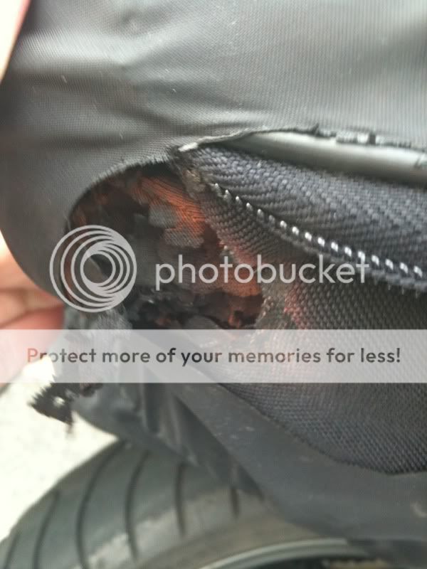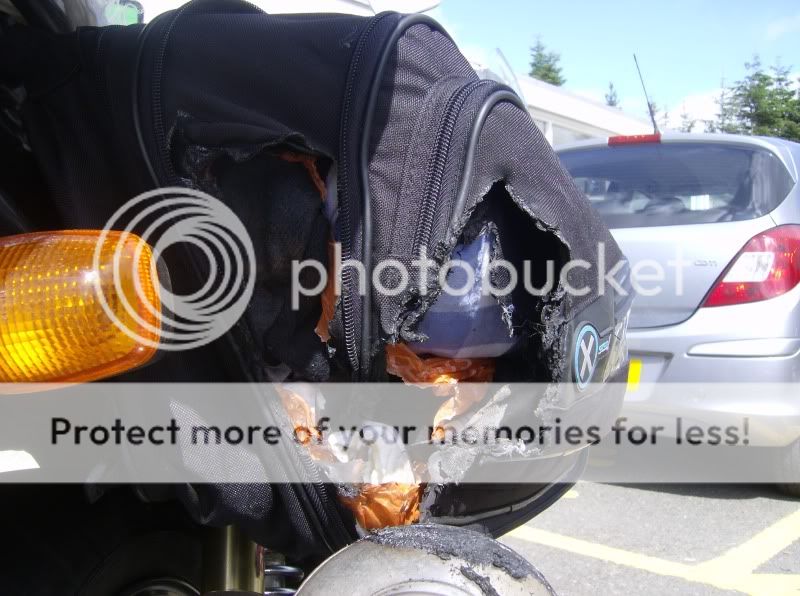 I've seen a fair few panniers melted and burned (not mine thank goodness), but never seen or heard of one exploding, so a big 10/10 to Mrs V for style!!  ____________________ 'The core of a man's spirit comes from new experiences'