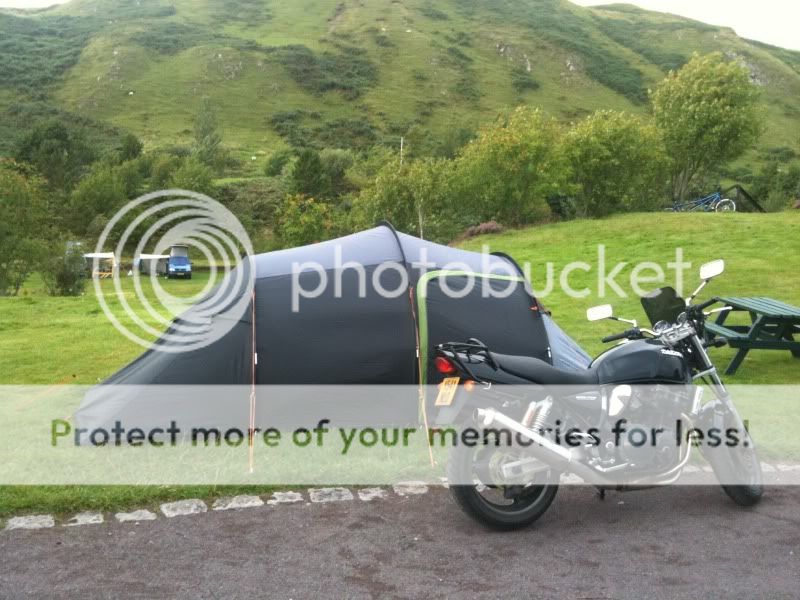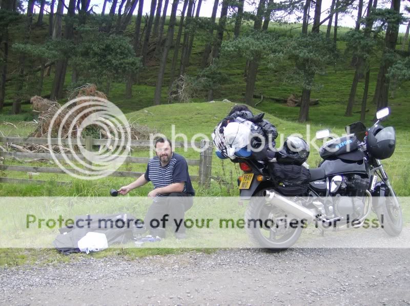 The final push got us to the campsite, east of St Mary’s Loch at the end of twenty miles of twisty single-lane B-road, liberally scattered with sheep who showed no inclination to move for a bike. I can’t praise these tiny little roads around the borders enough; you could pretty much aim for Hawick from any direction, take any road you see and be sure of a cracking, challenging run out. The crowning glory was that the Honey Cottage campsite was excellent, with lots of bikers having statics there and offering lots of tea and sympathy and advice on how to remove melted pannier from the exhaust.
