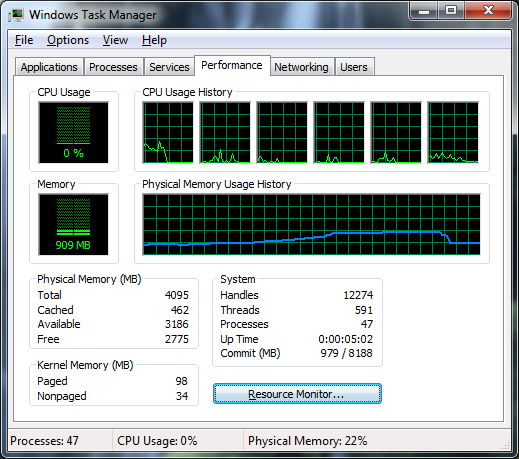 System load showing system usage after boot, then after running and closing a bunch of programs.