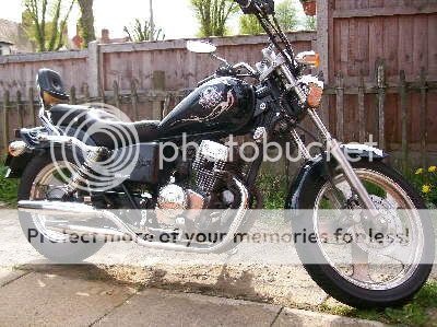 So, finally, I bought a Chinese chopper, for £400. An 05-plate, it was pretty new, and promiced to be reliable, and actually it was. Always started on the button, and for nearly two years, hardly gave any trouble. But it didn't suit me very well. I didn't really like the style, and the riding possition was terrible for me. I met Tef while I had this bike, and he started to actually teach me a few things about bikes..... like how to check a spark-plug or replace a drive chain! And he started adapting the controls on the cruiser so it fitted me better, and I could ride it more easily.