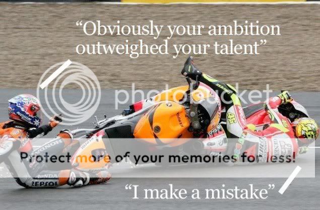 Notice how all the marshalls ran to Rossi's aid, and practically ignored Stoner...oops! Not to say I wouldn't have done exactly the same in that situation.... Laughing