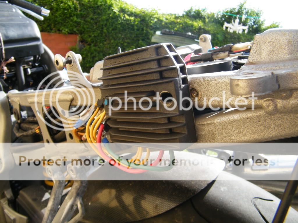 Edit: forgot to mention, it's not a standard reg/rec in the bike. not sure what it's from, but it's higher rated anyway. non-standard wiring from my alarm too, and you can see where there's been the wires from the alternator cut before to join up the new reg/rec.