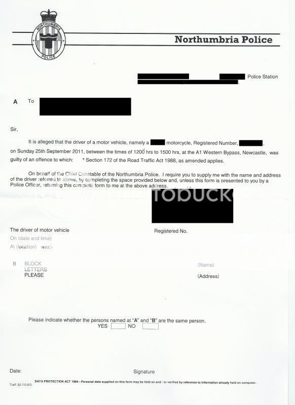 Its from Northumbria Police asking me to provide details of who was the rider (Section 172 blah blah) on 25th September on the A1 Western Bypass as they were guilty on an offence?? The posty said the guy round the corner with a bike got one aswel.