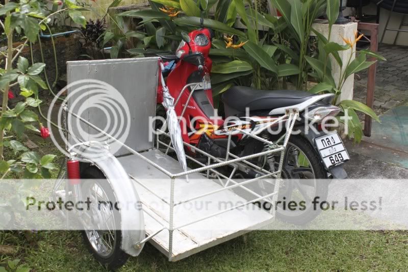 When we saw him he'd just had a new Honda Click scooter converted to a 3 wheeler - took 2 days (Anything is possible in Thailand!) so he could keep mobile. At other times he was transported in a motorcycle sidecar/wheelchair carrier, again made almost overnight - can you imagine health & safety issues with these in the UK?