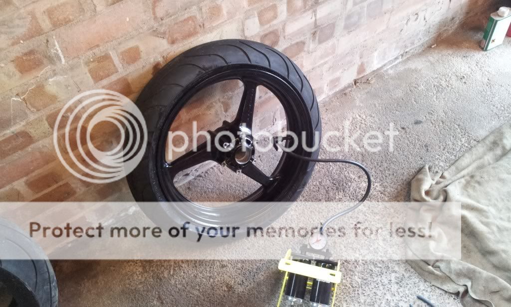 front tyre fitted and ready for pumping back up. Sealing a tyre onto a bead does not require a compressor, contrary to popular belief, my footpump method works first time everytime Cool