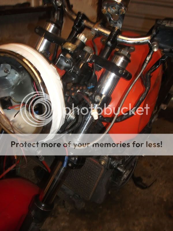 Later that night I ran the bike for about 20 minutes (after getting my new dials (whatever the correct name for them is), and watched the temperature go up and up with no fan kicking in, later I checked the back of the fan and found out that there was just a length of cable leading to no where. I'd also found out that my temporary ignition switch wouldn't cut the engine when I wanted it to.