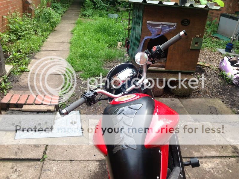 Was waiting on having to buy a 60 quid clamp on oberon, but today bastardised an bolanger push bike water carrier and the HK ripp offs to achieve the solution i want for handlebar bar end rngs, filtering / filth avoidance, and getting through gates.