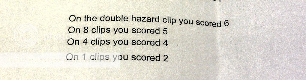 The way it works is that in each clip (bar one) there is one hazard. There is also a scoring window. The scoring window and the hazard sort-of line up. When the hazard starts happening (in someone's opinion) the scoring window opens and at that point a click is worth 5 points. This then counts down (behind the scenes) 4, 3, 2, 1, 0. By the time the hazard is really obvious the counter is down to about 2 or 3.