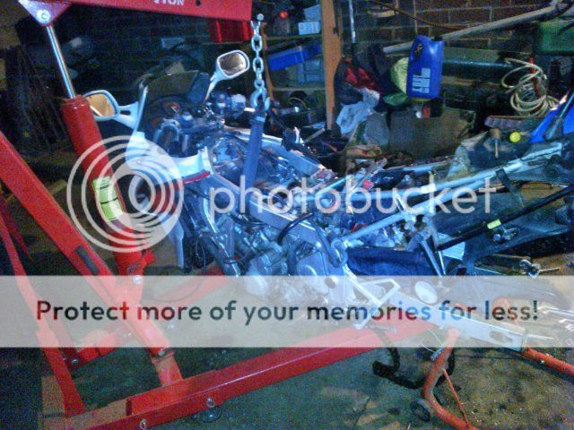 I Wanted to paint the wheels up as they looked quite rough, I have a rear paddock stand so taking the rear wheel off was easy. Then i thought "how am i going to get the front off, then i had an idea, i have an engine crane lol.