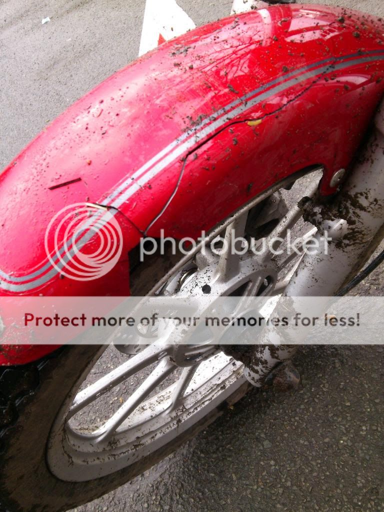 it bent the bars quite badly, and the left foot peg. ripped my cheap waterproof trousers to bits, and I'm glad I had a decent jacket on as I landed on my shoulder.