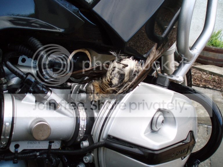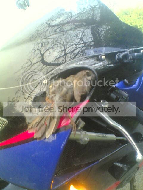 Although it seems in the split second the bird was in contact with the bike, it managed to empty the contents of it's bowel all over the engine. Now there's baked on bird shit on the casing and coolant pipes. Laughing