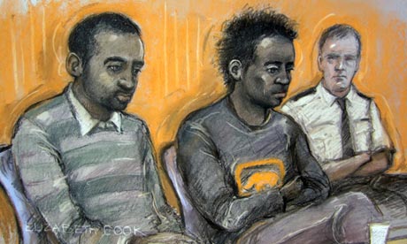 A court sketch shows Kevin Liverpool, left, and Junior Bradshaw. The duo are accused of a plot to rob and murder Joss Stone. Photograph: Elizabeth Cook/PA