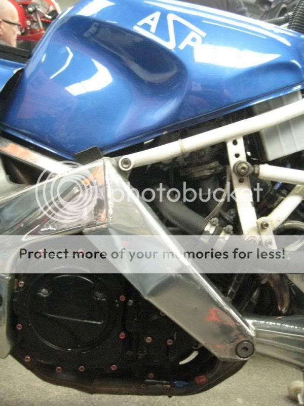Exup1000 swing-arm modified for twin shocks.May even be an Exup engine as the frame is a bastardised Exup item.Front calipers are Harrison 6 pots.
